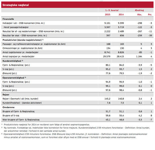 Resultat for perioden 1.-3. kvartal 2015 udgør 397 mio. kr. før skat og 475 mio. kr. før skat korrigeret for poster af engangskarakter, hvilket er 41 mio. kr. bedre end resultatet for samme periode sidste år. DSB har som ventet haft færre passagerer i trafikken over Storebælt i forbindelse med de store sporarbejder på Vestfyn, men dette tab mere end opvejes af flere passagerer i særligt den sjællandske regionaltrafik og på S-banen. Med de kortere rejser har DSB dog færre passagerindtægter end i samme periode sidste år.