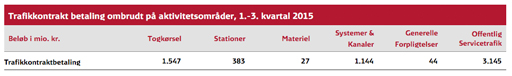 DSB har også for denne delårsrapport gennemført en analyse af togdriftsøkonomien fordelt på de aktivitetsområder, der er fastlagt i trafikkontrakten for 2015-24 med Transport- og Bygningsministeriet. Analysen offentliggøres parallelt med delårsrapporten.